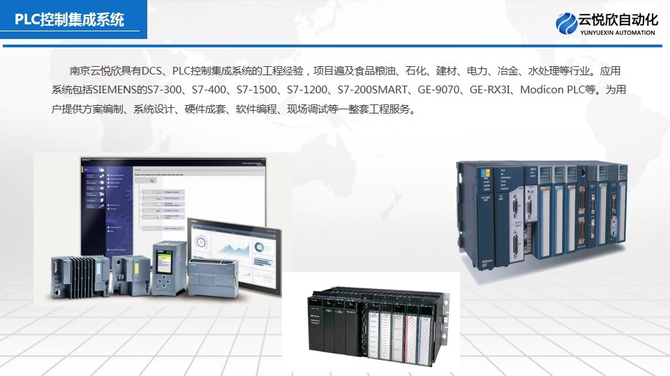 南京云悅欣自動化工程有限公司有從事DCS、PLC控制系統(tǒng)集成的工程經驗,項目可遍及石化。建材。電力、冶金、水處理等行業(yè)。應用的系統(tǒng)包括ABB的Frelance2000 、SIMENS-S7-300、400、GE-9070、Modicon PLC等??蔀橛脩籼峁┓桨妇幹啤⑾到y(tǒng)設計、硬件成套、軟件編程、現(xiàn)場調試等一整套工程服務。